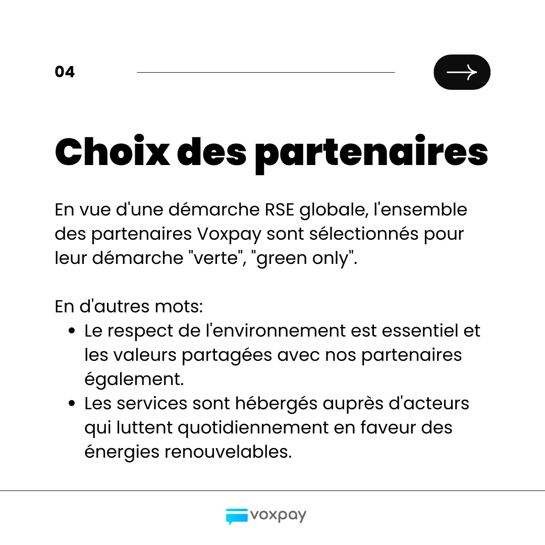 Chez Voxpay, nous avons à coeur de répondre quotidiennement à ces enjeux de transition énergétique, de réduction d'empreinte carbone, c'est pourquoi nous tenons à vous partager nos engagements pour un numérique plus responsable!